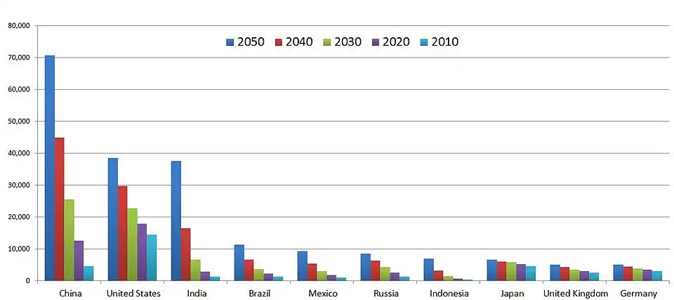 In 2016, an Australian economist predicted that in 2050, China and India will be first and second respectively in terms of GDP per capita spending, surpassing the United States. Brazil was predicted to be in the fifth position. This was attributed due to the global economic center shifting from the Atlantic to the Asia Pacific region.[15]