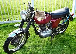 The BSA C15S was the scrambler (motocross) competition version of the 250 cc Star produced between 1959 and 1965. As with the trials model, the C15S saved the weight of a battery through an 'energy transfer' electrical system which was notoriously unreliable.[3] The problem was that the timing and points gap required far too much careful setting for a rugged competition motorcycle. The scrambler C15 shared the same frame as the trials (designated with a C suffix), had a larger exhaust valve, higher compression ratio and modified camshaft for more power. It was unsilenced and had special tyres and strengthened fork springs with rubber fork gaiters to protect the seals.[4]