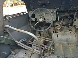 Two types of seating arrangements were available: the first consists of wooden benches on either side of the troop compartment facing inwards; the second consisted of three rows of seats facing forward.[11] Both the driver and the radio operator seated to his right are provided with individual windscreens and, when in combat, these are covered by twin armored shutters with integral vision blocks.[11] Crew members exit the vehicle through side doors, the tops of which are hinged and fold down for observation purposes.[11]