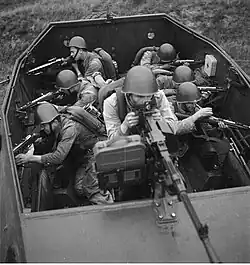 By the end of the war, the initial Soviet tactic of tank desant, in which the infantry rode into battle atop the tanks they were supporting, had been superseded by the introduction of M3 Half-tracks and M3 White armored cars.[13] These were widely used for troop transport, giving rise to a new doctrine in which armored vehicles capable of keeping pace with tanks brought infantry to an engagement. The infantrymen would then disembark and enter combat on foot.[14]