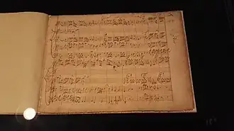 F-Sn Ms 2.965 and D-B Mus. ms. Bach St 131 are manuscript copies of the concerto realised during the composer's lifetime, in 1721 and around the 1730s respectively, after the autographs of the final version.[15][16] In his Triple Concerto, BWV 1044, Bach returned to the format of the fifth Brandenburg Concerto. A handful extant copies of the fifth Brandenburg Concerto were produced in the second half of the 18th century.[17] In this period Bach's autograph score and performance parts of BWV 1050 were owned by Johann Kirnberger and the composer's son Carl Philipp Emanuel respectively: by the middle of the 19th century both manuscripts were in the possession of the Berlin State Library, the former via Kirnberger's pupil Princess Anna Amalia of Prussia and the Joachimsthal Gymnasium, and the latter via Georg Poelchau.[12][11][18]
