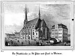 The cantata is Bach's earliest extant cantata for Christmas Day, possibly composed in Weimar as early as 1713.[2] The text of the cantata, which echoes theologians in Halle, suggests that it was composed with Halle's Liebfrauenkirche in mind, in 1713, when Bach applied to be organist of this church, or in 1716, when he was involved in rebuilding its organ. The text is possibly by that church's Pastor primarius Johann Michael Heineccius, who also wrote the libretti for other Bach cantatas definitely written for Halle and had favoured Bach's application for organist at the church as a successor to Friedrich Wilhelm Zachow. Musicologist Christoph Wolff deduces from the "lavish forces" of four trumpets, timpani and three oboes on top of the strings, an unprecedented scoring in Bach's cantatas, that the work was not composed for the intimate Schloßkirche in Weimar. He dates it as 1714 or 1715.[3] According to John Eliot Gardiner, the first performance may have taken place in Weimar in the church of St. Peter und Paul, performed by the combined musicians of the ducal Capelle and the town.[4]