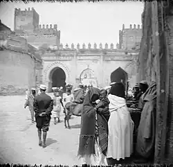 Bab Dekkakin itself was restored and modified in 1884, in the reign of Sultan Moulay Hassan.[5][4] In particular, the gate's central arch was opened up to provide a straight or direct passage across it instead of the original bent entrance, in order to facilitate circulation (similar to what was later done to Bab Semmarine too).[4] In or after 1912, another passage or archway was opened on the east side of the central arch (to the left when seen from the Old Mechouar) and was given a similar decorative outline as the western archway in order to create visual symmetry.[4] The overall form of the gate, however, including the massive towers flanking it, appear to be original from the Marinid period.[3] Up to the early 20th century, there was also a prison attached to Bab Dekkakin, where prisoners serving long sentences were kept.[2]: 267