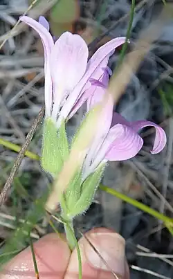Babiana ambigua is a species of plant in the Iridaceae. It is endemic to the Western Cape province of South Africa.[1][2] It is a geophyte, that appears from an underground corm every year and grows to a height of 5–8 cm (2.0–3.1 in) or occasionally up to 16 cm (6.3 in). Its leaves are pleated, hairy, lance-shaped, reaching higher than the inflorescence. The fragrant, mirror-symmetric, blue to mauve flowers, consist of six tepals merged into a tube at their base, but with free lobes at the top. The lower lateral tepals have whitish markings accentuated by a more intense blue line along their margin. Each flower is supported by two green bracts sometimes with a brownish tip, and the inner bract is divided entirely to its base. There are three anthers crowded to the dorsal side of the perianth and a style divided in three branches on top of a smooth ovary.[3] Flowers can be found from late July at sea level to the end of September at high altitude.[4]