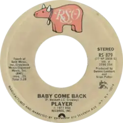 "Baby Come Back" is a song by the British-American rock band Player. It was released in late 1977 as the lead single from their 1977 self-titled debut album, and was the breakthrough single for the band, gaining them mainstream success, hitting #1 on the US Billboard Hot 100 for the three consecutive weeks of January 14, 21 and 28, 1978 and #10 on the R&B charts in 1978.[5] Their biggest hit single, the song was written and performed by Peter Beckett and J. C. Crowley, the founders of Player.