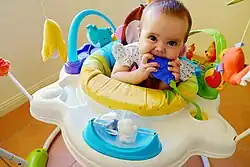 A baby jumper is a device that can be used by infants to exercise and play in. The original baby jumper consists of a hoop suspended by an elastic strap. More elaborate baby jumpers have a base made of hard plastic sitting in a frame and a suspended fabric seat with two leg holes, often with trays holding toys. The door jumpers lack the tray. There are also mobile play centers (baby walkers), which look very similar to baby jumpers, but which have wheels.
