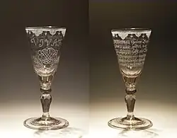 The exhibits include the so-called Bach spectacles long believed to have been worn by Bach,[57] and the Bach Goblet. It is still an unsolved riddle who may have been the donor of the goblet, and on what occasion Bach received it.[58] Bach's second, much younger wife Anna Magdalena is remembered with an always fresh bouquet of yellow carnations – she was a große Liebhaberin von der Gärtnerey (a great lover of gardening) and these were her favorite flowers.[59] Three rooms in the upper floor of the historical Bach House present historical living quarters (bedroom, living room, kitchen). Their furnishing is virtually unchanged since the rooms were first decorated by the Weimar Court Antiquary in 1906 with local items from around 1700 (including door handles and fittings).[60]