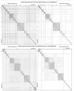 - ^ a b c d e Grose JH, Jensen GL, Burnett SH, Breakwell DP (October 2014). "Genomic comparison of 93 Bacillus phages reveals 12 clusters, 14 singletons and remarkable diversity". BMC Genomics. 15 (1): 855. doi:10.1186/1471-2164-15-855. PMC 4197329. PMID 25280881.