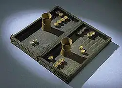The τάβλι of Emperor Zeno's time is believed to be a direct descendant of the earlier Roman ludus duodecim scriptorum ('Game of twelve lines') with the board's middle row of points removed, and only the two outer rows remaining.[11] Ludus duodecim scriptorum used a board with three rows of 12 points each, with the 15 pieces being moved in opposing directions by the two players across three rows according to the roll of the three cubical dice.[8][11] Little specific text about the gameplay of Ludus duodecim scriptorum has survived;[12] it may have been related to the older Ancient Greek dice game Kubeia. The earliest known mention of the game is in Ovid's Ars Amatoria ('The Art of Love'), written between 1 BC and 8 AD. In Roman times, this game was also known as alea.[13][14]