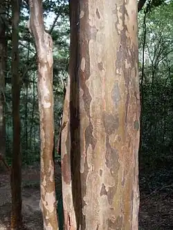 The trunk can be smooth and glossy, of an attractive orange-brown or pinkish mauve colour, or green where bark has recently been shed. At other times, the bark sheds irregularly resulting in a mottled trunk, similar to the spotted gum and the leopardwood.