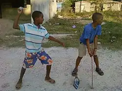 Several street variants of cricket exist in Latin America, such as bete-ombro and plaquita. In nearby Suriname, there is a game called "bat-en-bal" which is likely derived from cricket;[17] in bat-en-bal, one end of the pitch has a set of stumps.[18]
