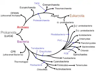 Phylogenetic tree of Bacteria, Archaea and Eukarya, with the last universal common ancestor (LUCA) at the root[18]