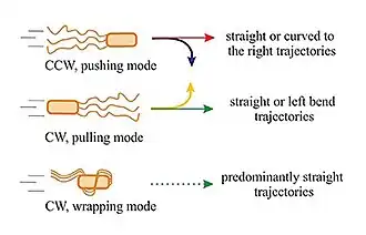 In the pushing mode, the rotating flagella (assembled in a bundle or as an open tuft of individual filaments) drive the motion from the rear end of the cell body. The trajectories are either straight or, in the vicinity of a solid surface, curved to the right, due to hydrodynamic interaction of the cell with the surface. The direction of curvature indicates that pushers are driven by a left-handed helix turning in CCW direction. In the pulling mode, the rotating flagellar bundle is pointing ahead. In this case the trajectories are either straight or with a tendency to bend to the left, indicating that pullers swim by turning a left-handed helical bundle in CW direction. Finally, P. putida can swim by wrapping the filament bundle around its cell body, with the posterior pole pointing in the direction of motion. In that case, the flagellar bundle takes the form of a left-handed helix that turns in CW direction, and the trajectories are predominantly straight.[56][3]