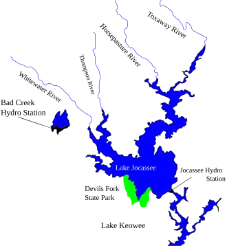 The Bad Creek Hydroelectric Station is a pumped-storage hydroelectric power station located 8 miles (13 km) north of Salem in Oconee County, South Carolina. The 1,065 megawatts (1,428,000 hp) power plant is owned by Duke Energy and its last generator was commissioned in 1991. The power station generates electricity by shifting water between an upper and lower reservoir. The upper Bad Creek Reservoir was created by damming Bad Creek and West Bad Creek while Lake Jocassee serves as the lower reservoir. During periods of low energy demand, the four 266 megawatts (357,000 hp) Francis pump turbines pump water from Lake Jocassee which lies at an elevation of 1,110 feet (340 m) to the Bad Creek Reservoir at an elevation of 2,310 ft (704 m) through a 1 mile (1.6 km) tunnel. When energy demand is high, water is released back from Bad Creek Reservoir back down to the pump turbines which then operate as generators. After electricity is produced, the water is returned to Lake Jocassee. The process is repeated as needed, primarily with the facility serving as a peaking power plant.[1][2][3]
