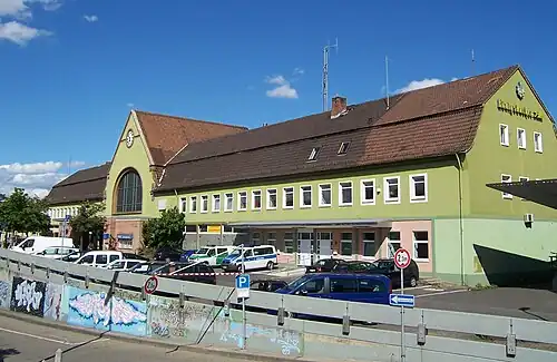 The first station in Bad Kreuznach was opened in 1858 with the Nahe Valley Railway and was later used as a freight yard, which is now closed.[5] Between 1896 and 1936, the Kreuznach Light Railways (Kreuznacher Kleinbahnen), a network of 750 mm gauge lines, also terminated at the station. On 1 June 1864 a second station opened in southern Bad Kreuznach called Kreuznach Bad to improve access to the southern part of the city. With the opening of the railway line to Gau-Algesheim in 1902, the present station was built at the junction of two lines between the two stations. The station went into operation in 1905 and the entrance building was built between 1905 and 1908. In due course the other two stations were closed.[6]