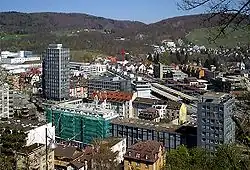 Downtown Baden is located on the left bank of the river Limmat in its eponymous valley.[6] Its area is divided into the Kappelerhof, Allmend, Meierhof, and Chrüzliberg. In 1962, Baden also absorbed the adjacent village of Dättwil. On the right bank of the river is the village of Ennetbaden, formerly "Little Baden" (Kleine Bäder).[7]