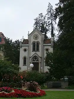 The Three Kings Chapel stands on a terrace at the northern end of Bäderstrasse. The building, designed by Robert Moser, was built in 1882 in the neo-Gothic style. Its front part is designed as a gabled porch with lateral transverse annexes. The altarpiece in the choir is a work by Joseph Balmer from 1887 and depicts the Three Kings. The chapel replaced the previous Romanesque building a few meters to the north, which dated back to around 1100 and had been left to decay for decades before finally having to make way for the park of the Grand Hôtel.[22] This luxury hotel, located between the northern end of Bäderstrasse and the banks of the Limmat, opened in 1876, went bankrupt more than six decades later, and was demolished in 1944. Its annex, the Römerbad, dating from 1860, remained until it was finally demolished in 2017 to make way for the new thermal baths designed by Mario Botta.