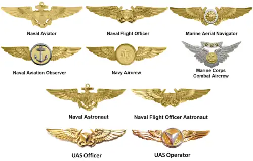 Officer insignia include the Naval Aviator insignia and Unmanned Aerial System (UAS) Officer insignia[a] for pilots and the Naval Flight Officer (NFO) insignia for non-piloting officers. There is also an astronaut version of the aviator and NFO Insignia, known as the Naval Astronaut and Naval Astronaut (NFO), respectively.