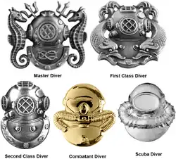 Diver insignia are issued to personnel who are qualified divers and is given in several degrees. The first degree of diver insignia is SCUBA Diver. The remaining insignia are awarded for deep sea dive qualifications and are issued in the degrees of Second Class, First Class, and Master Diver.