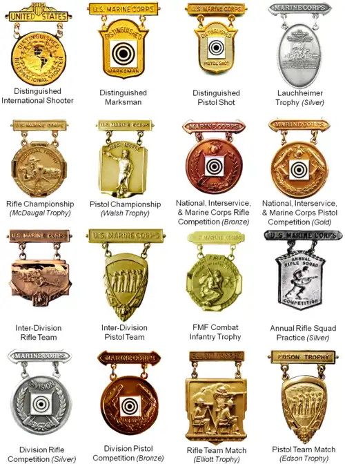 In addition to the standard marksmanship badges, the Marine Corps has numerous marksmanship competition badges that are authorized for wear on the Marine Corps uniform as permanent awards. These badges are awarded alongside trophies that are present to the top-performing Marines at Marine Corps sponsored marksmanship competitions. The following marksmanship competition badges are authorized for wear on Marine Corps service uniforms and are listed in order of precedence:[4]
