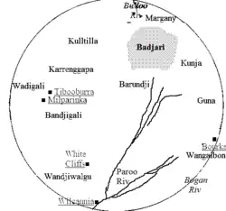 According to Norman Tindale, the Badjiri lands spanned some 4,100 square miles (11,000 km2), reaching from around Hungerford to Eulo on the Paroo River. Their eastern limits were around Barringun, Tinnenburra, Tuen, and Cunnamulla. They were also present at Caiwarro and about the eastern side of Currawinya.[1]