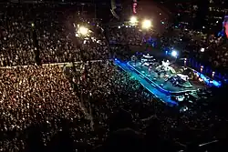 As evidenced by its appearance on three live offerings, "Badlands" has been a staple of Springsteen and E Street Band concert performances. It is Springsteen's fourth most played song in concert besides "Born to Run", "Thunder Road" and "The Promised Land".[9] It opened shows on the 1978 Darkness Tour before the album had even been released, a slot it held for much of that tour (one such performance from Arizona Veterans Memorial Coliseum was filmed and released as a promotional video in the early 1980s). It was featured near or at the end of the first set during the 1980–1981 River Tour (one such performance from Arizona State University, famously introduced by Springsteen decrying the election of Ronald Reagan as president the night before, was included on Live 1975–85, less the intro), a spot it held for much of the 1984–1985 Born in the U.S.A. Tour until the stadium shows, when it was used to keep momentum going out of the opening "Born in the U.S.A.". "Badlands" was put on the shelf for most of the 1988 Tunnel of Love Express, a mark of how radically that tour sought to throw out stock show elements. Once the 1992–1993 "Other Band" Tour was underway, it was quickly added back in for some needed mid-first-set energy. Springsteen seemed to conclude it fit this role, as he kept it in the same "10 songs in" position during all of the 1999–2000 Reunion Tour and 2002–2003 Rising Tour shows, recapturing audience enthusiasm after less familiar material such as "Murder, Inc." or "Worlds Apart" were performed. On the 2007 Magic Tour, however, the shortened show time resulted in "Badlands" becoming even more prominent as the main set closer. For the 2009 Working on a Dream Tour, "Badlands" resumed its old role as the show opener; it stayed in that slot until the final two months of the tour—when Springsteen chose to play the Born to Run album in its entirety at a show, "Badlands" was usually shifted to be the final song of the main set, which the track "Born to Run" had previously held on the tour.