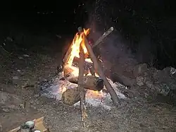 There are many interpretations for the meaning of the badnjak, but scholars agree that it is a remnant of pagan Indo-European times that has adapted to Christianity. Today, the festive kindling of the log commemorates the fire that—according to folk tradition—the shepherds of Bethlehem built in the cave where Jesus Christ was born, to warm the baby Jesus and his mother Mary throughout the night. The badnjak may also be seen as a symbol of the cross upon which Christ was crucified, the warmth of its fire symbolizing the salvation which, in the Christian belief, the crucifixion made possible for mankind. As the log burned and turned into ashes, it symbolized Christ's resurrection and his triumph over sin. Scholars regard the tradition as inherited from the old Slavic religion, where Christians began referring to the celebration of Christmas as the Feast of Lights.[2] They interpret the badnjak as an incarnation of the spirit of vegetation, and as a divinity who dies by burning to be reborn, to whom sacrifices and prayers were offered for the fertility of fields, the health and happiness of the family, in which the rekindling of the hearth-fire symbolizes its importance and center of family life throughout many generations.[3] In some parts, some people focus more on the cult of their dead, where they equate the burning fire to their departed family members.[4]