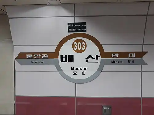 Baesan Station (Korean: 배산역; Hanja: 盃山驛) is a station of the Busan Metro Line 3 in Yeonsan-dong, Yeonje District, Busan, South Korea.