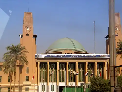 Baghdad Central Station or Baghdad International Station is the main train station in Baghdad.[1] It links the rail network to the south and the north of Iraq. The station was built by the British and designed by J. M. Wilson, a Scot who had been an assistant to Lutyens in New Delhi and who subsequently set up a practice of his own in Baghdad.[2] It has been described as the "Crown Jewel" of Baghdad by the BBC.[1] Construction started in 1948 and finished in 1953. The station is the biggest one in Iraq. It was renovated during the American occupation of Iraq in the 2000s.[1]