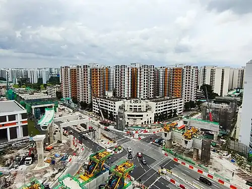 The contract for the design and construction of Bahar Junction station and the adjacent Jurong West station was awarded to China Railway 11 Bureau Group (Singapore Branch) in December 2019. The S$210.1 million (US$154.01 million) contract also included the construction of 1.15 kilometres (0.71 miles) of associated viaducts.[5] Construction was scheduled to start in 2020, with a scheduled completion date of 2026.[6] However, the restrictions on construction due to the COVID-19 pandemic has led to delays, with the completion date pushed to 2027.[7]