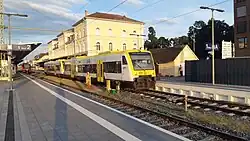 Friedrichshafen Stadt (city) station is the largest railway station of the city of Friedrichshafen on Lake Constance (Bodensee) and a railway junction in the German state of Baden-Württemberg. It has five tracks and is classified by Deutsche Bahn as a category 3 station.[1] Each day it is used by about 160 trains operated by Deutsche Bahn and the Bodensee-Oberschwaben-Bahn (BOB). Ulm–Friedrichshafen railway from Ulm ends at the station, where it meets the Stahringen–Friedrichshafen railway and the Friedrichshafen–Lindau railway. Another major railway station in the city, Friedrichshafen Hafen station (Friedrichshafen port station), which is operated as part of Friedrichshafen Stadt station, was used until 1976 for loading and unloading carriages on the Lake Constance train ferry to Romanshorn in Switzerland.