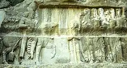 A sixth relief, portraying an equestrian combat, was carved directly below the tomb of the Achaemenid King of Kings Darius the Great (r. 522–486 BCE).[11] The relief has two panels. The top panel depicts Bahram II's war against Carus, which he claims as a victory. The lower panel depicts Bahram II's war with Hormizd I Kushanshah.[11][18] A seventh relief, at Tang-e (or Sarab-e) Qandil, depicts a divine investiture scene, with Bahram II receiving a flower from Anahita.[42] Bahram II also erected two rock reliefs in Barm-e Delak: the first depicts Bahram II giving a flower to Shapurdukhtak; the second depicts Bahram II making gesture of piety, whilst being offered a diadem by a courtier.[42]