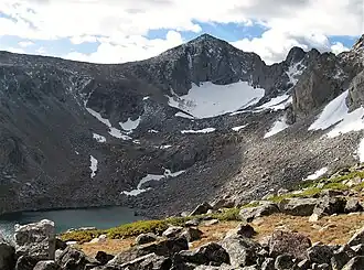 Bair Peak (12,335 feet (3,760 m)) is located in the Wind River Range in the U.S. state of Wyoming.[3] The mountain is on the Continental Divide in the Bridger Wilderness of Bridger-Teton National Forest and Popo Agie Wilderness of Shoshone National Forest. Washakie Glacier lies on the north slopes of the peak.