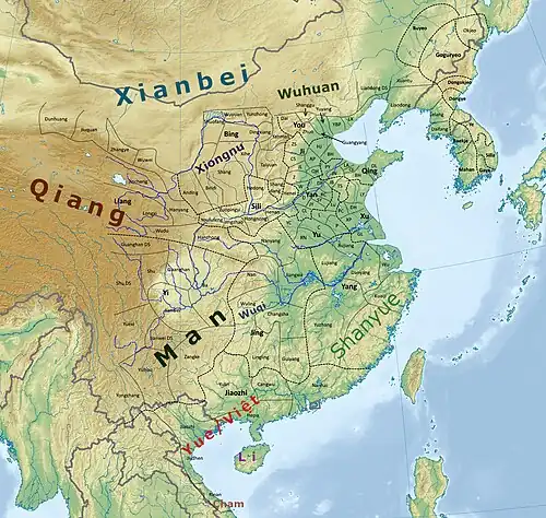 The term Baiyue first appears in the Lüshi Chunqiu, compiled around 239 BC.[15][16] It was later used as a collective term for many non-Huaxia/Han Chinese populations of Southern China and Northern Vietnam.[3]