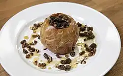 Fillings may be fresh or dried fruits such as raisins, dates, prunes, oatmeal, as well as nuts such as pistachios[8] or walnuts, which are typical in Bulgaria;[9] the Bosnian dish tufahije is also stuffed with walnuts, but is poached rather than baked; marzipan is sometimes used in Germany. Many recipes include lemon juice for tartness.[6][10]