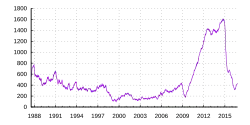 The number of actively-drilling rigs in North Dakota peaked at 217 rigs in Spring 2012, with the rig count averaging 180-190 throughout 2013.[27] Each of the rigs is estimated to create roughly 125 new full-time jobs. This meant a total growth of around 25,000 jobs, including an extra 10,000 jobs for workers who lay pipes to producing wells and produce processing plants.[24] Some estimates predicted that North Dakota could have as many as 48,000 new wells, with drilling taking place over the next two to three decades.[28]