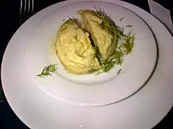 Fava, also known as bakla ezmesi, is a traditional Turkish dish made of dried fava beans (broad beans, called bakla in Turkish), which are soaked and dehulled, leaving the deeper green split inner seeds. These are boiled, typically with onion, until very soft, mixed with salt, pepper, sugar, lemon juice and olive oil, and pureed. The resulting paste is chilled until it sets and can be cut into cubes. This dish is served cold, sprinkled with olive oil and chopped dill.[1][2]