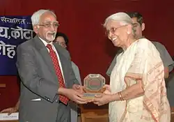 Mr. Mohammad Hamid Ansari, Vice President of India presenting a memento to Mrs. J. Robinson, 1st Principal of the Bal Mandir - Bal Vidyalaya, at the Golden Jubilee Celebrations of the Bal Hitkari Samiti, at Kota, Rajasthan on 15 May 2008.[2]