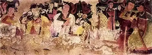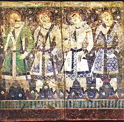 Many authors have suggested that the figures in the Balalyk Tepe paintings are characteristic of the Hephthalites (450-570 CE).[13] In this context, parallels have been drawn with the figures from Kizil Caves in Chinese Turkestan, which seem to wear broadly similar clothing. The paintings of Balalyk Tepe would be characteristic of the court life of the Hephthalites in the first half of the 6th century CE, before the arrival of the Turks.[14][15]