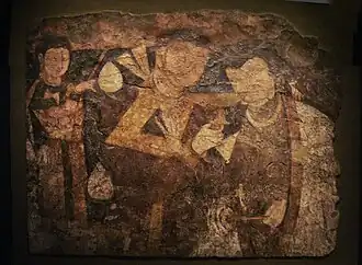 The theme of the Balalyk-tepe is uniformly related to feasting.[7] The style of the painting is quite different from the native style of Penjikent, Afrasiab or Varakhsha.[7] Although the pervasive theme of the banquet is different from the religious theme of the Buddhist murals of Tokharistan, and the painting do not have a Buddhist character despite the presence of a few elements, some similarities can be found in style and iconography.[8]
