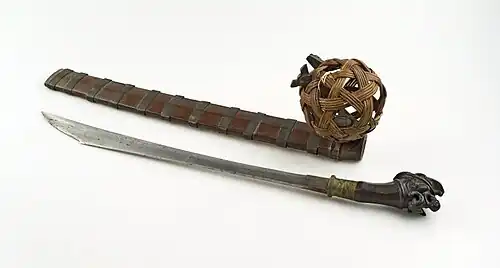 The scabbard is made of wood with brass or rattan bindings along the scabbard. Often a round rattan basket is attached to the scabbard to keep various amulets in. Normally, the southern Balatos have more decorated baskets on their scabbards compared to the northern region.[1]