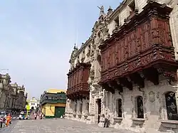 The earthquakes of 1655, 1687, 1746 and 1940 destroyed many of the old colonial structures in Lima designed by Francisco Pizarro[4] and transformed the city's politics and architecture. Sturdy and less elaborate styles became increasingly popular after 1746 in order to ensure the stability of buildings.[3] After the earthquake of 1940, Bruno Roselli, a Florentine art history professor known as the "defender of balconies", endeavored to salvage numerous balconies, many of which were of the 17th and 18th century styles.[5] So committed was he to their salvation that he compared the balconies' importance to that of the Eiffel Tower, Statue of Liberty and the lions in Trafalgar Square.[6] However, he was not successful.