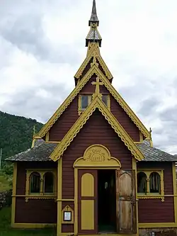 St. Olaf's Church, also known as the English Church, is an Anglican church built in the style of a Stave church. The church was completed in 1897 as a memorial to Margaret Green. Margaret, an English lady, came to the fjords as a tourist to hike the mountains. She met, fell in love with and married Knut Kvikne who was an avid mountain man. Being a very pious woman, she wished for an Anglican church in Balestrand. She started the church with her husband, but died before its completion. Sunday services are held during the summer months, being conducted by rotating vicars from England.[35][36]