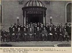 The mission's purpose was to promote wartime cooperation, and to assess the war-readiness of Britain's new partner.[2] British Foreign Secretary Arthur Balfour, President Woodrow Wilson and Wilson's chief advisor, Colonel House, had a meeting that discussed the secret treaties which bound Britain and France to Italy and others. Members of the delegation met with many senior leaders in the national government, finance, industry and politics, to explain the British positions. Other meetings dealt with the supply of munitions and other exports, and the proposed Balfour Declaration.