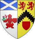 • Blazon: Parted per pale, on the dexter side the official coat of the Lyon King of Arms, namely: Argent, a lion sejant full-faced gules, holding in his dexter paw a thistle slipped and leaved Vert, and in his sinister a shield of the second; on a chief Azure, a saltire Argent. On the sinister, his paternal arms: Or, a Chevron indented Sable between two lions rampant in chief and an Escutcheon in base Gules. Mantling Sable, doubled Or; and upon a wreath of his liveries is set for crest, a lion sejant guardant Gules, his dexter paw resting upon an Escutcheon as in the arms; and in an escroll above, the Motto: Pro Rege et Republica.