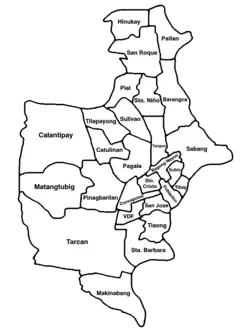Baliwag is politically subdivided into 27 barangays, as shown in the matrix below. Each barangay consists of puroks and some have sitios.