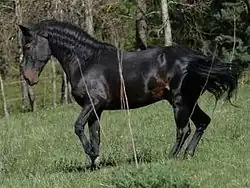 The Kabarda has been bred since the 16th century by mountain tribesmen in the northern Caucasus, and is the product of centuries of selective breeding for the ability to survive in harsh conditions. The Kabarda breed was formed from a combination of steppe horses, the Karabakh, the Arabian and the Turkoman. The breed are usually kept in herds, and are moved between mountain pastures in the summer and foothills areas in the winter.[1] A theory exists that Kabardian and Cleveland Bay breeds may have common origins.[2]