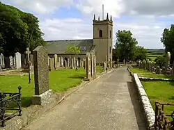 Arbory parish church of St Columba is located in Ballabeg. It also has a graveyard and a vicarage adjacent to the site. The present church building was most likely built on the site of a much older early Christian keeill (small chapel).[10] The church was dedicated in 1759 by Bishop Mark Hildesley.[11] The exterior church walls were originally whitewashed before being coated in grey pebbledash in the 20th century.[11] The bell tower was added in 1915 in memory of local physician and Manx traditional music collector Dr. John Clague who was buried in the graveyard.[12] The large churchyard has graves dating back at least to the mid-18th century. Its best known occupant is Captain John Quilliam, who helped steer the damaged HMS Victory as First Lieutenant at the Battle of Trafalgar.[13] Manx lexicographer Archibald Cregeen was also buried there.[14]