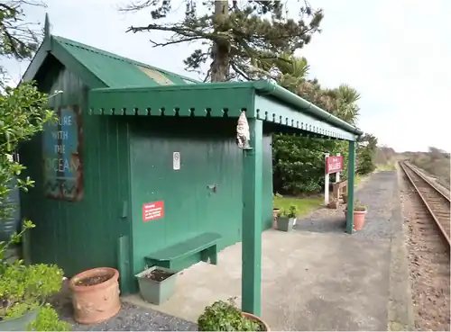 The station is served seasonally by the Isle of Man Railway; other nearby stations are Castletown to the southeast and Colby to the west. The original station building here, installed in 1877, was a more elaborate affair: it was similar in appearance to third class timber buildings at other stations along the line although smaller in size but still with a station master and other platform staff. The date this building was removed is unknown, but the replacement hut has been on the site for many years. The first structure featured staff accommodation, waiting room ladies room and a later lean-to toilet block at the rear and was located closer to the roadway than the current version.