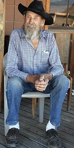 Seldom Seen Slim (Charles Ferge) was the sole resident of Ballarat from approximately 1918 until his 1968 death at the nearby Trona Hospital, where he died of cancer. Slim claimed not to have bathed in twenty years except for sloshing water on his naked body while standing outdoors. After the town's one remaining adobe building degraded beyond liveability, Slim lived in a Volkswagen and house trailer. Slim was the 28th and final person to be interred at Ballarat's boot hill. He used to say, "Just bury me where the digging's easy."[3]